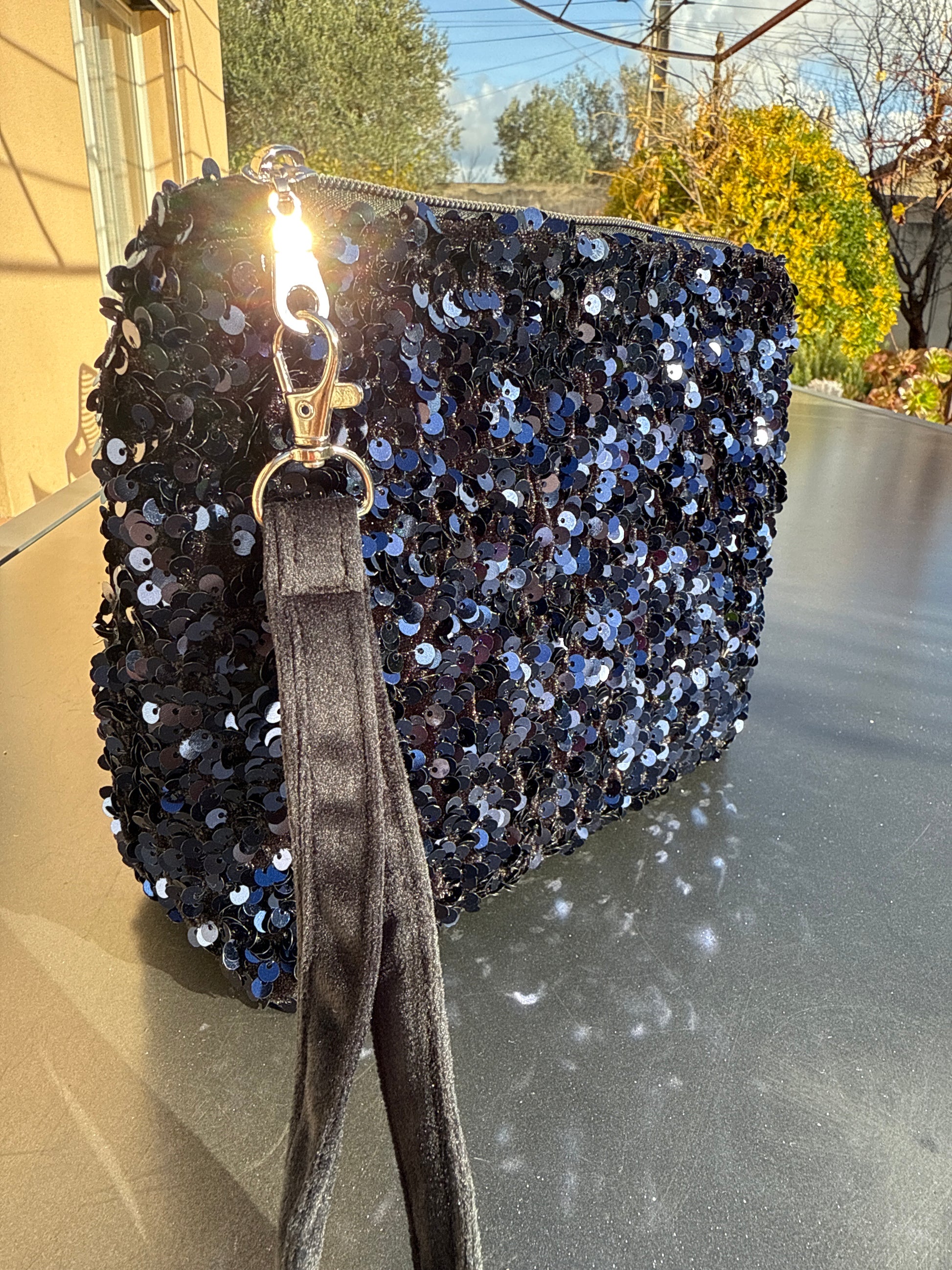 Pochettes sequins bleus avec boucles couleur argent
