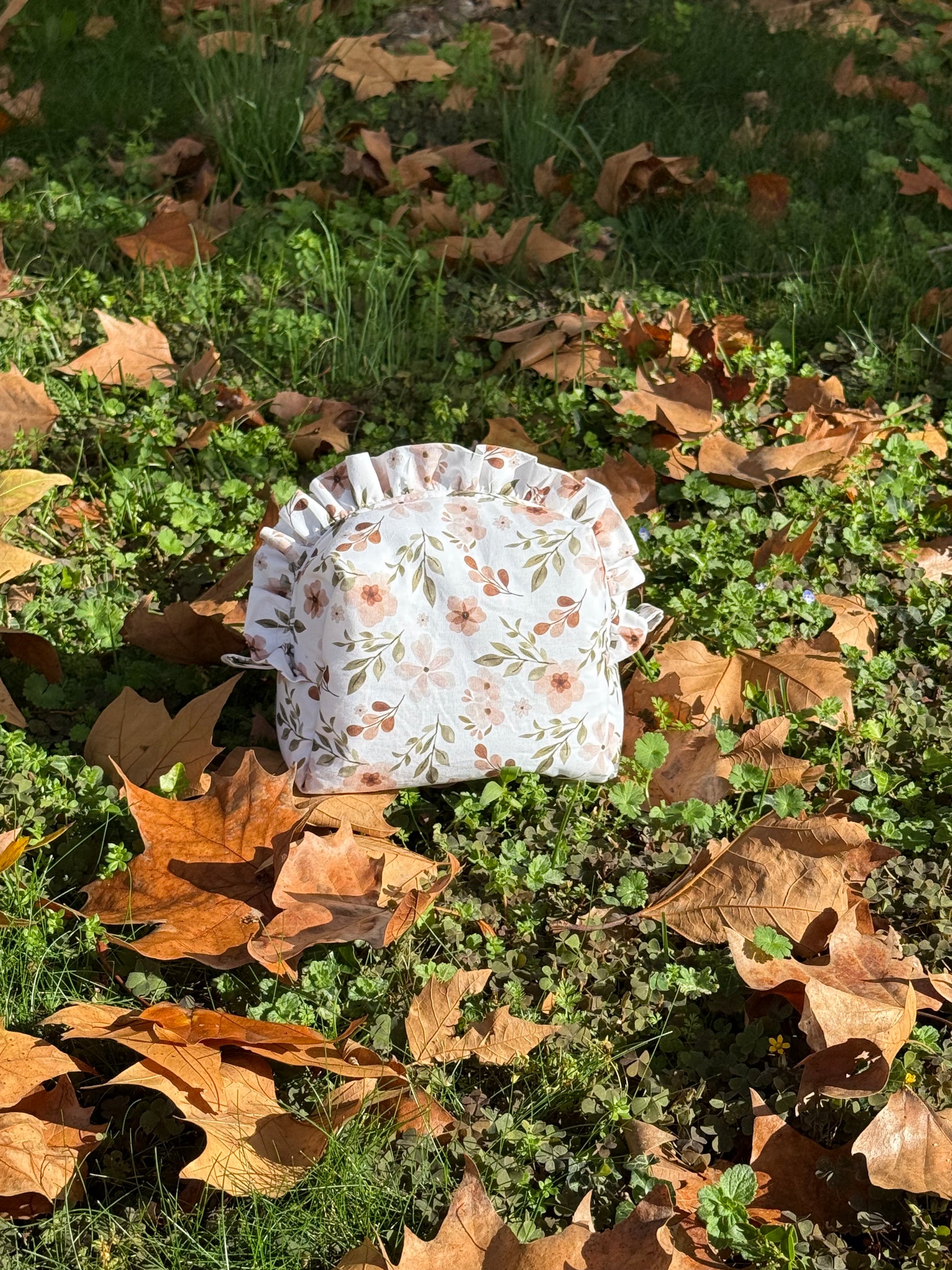 Apportez une touche d’élégance et de raffinement à votre quotidien avec cette trousse de toilette en coton délicat et fleuri avec volant . Idéale pour ranger vos essentiels de beauté ou de voyage avec style.