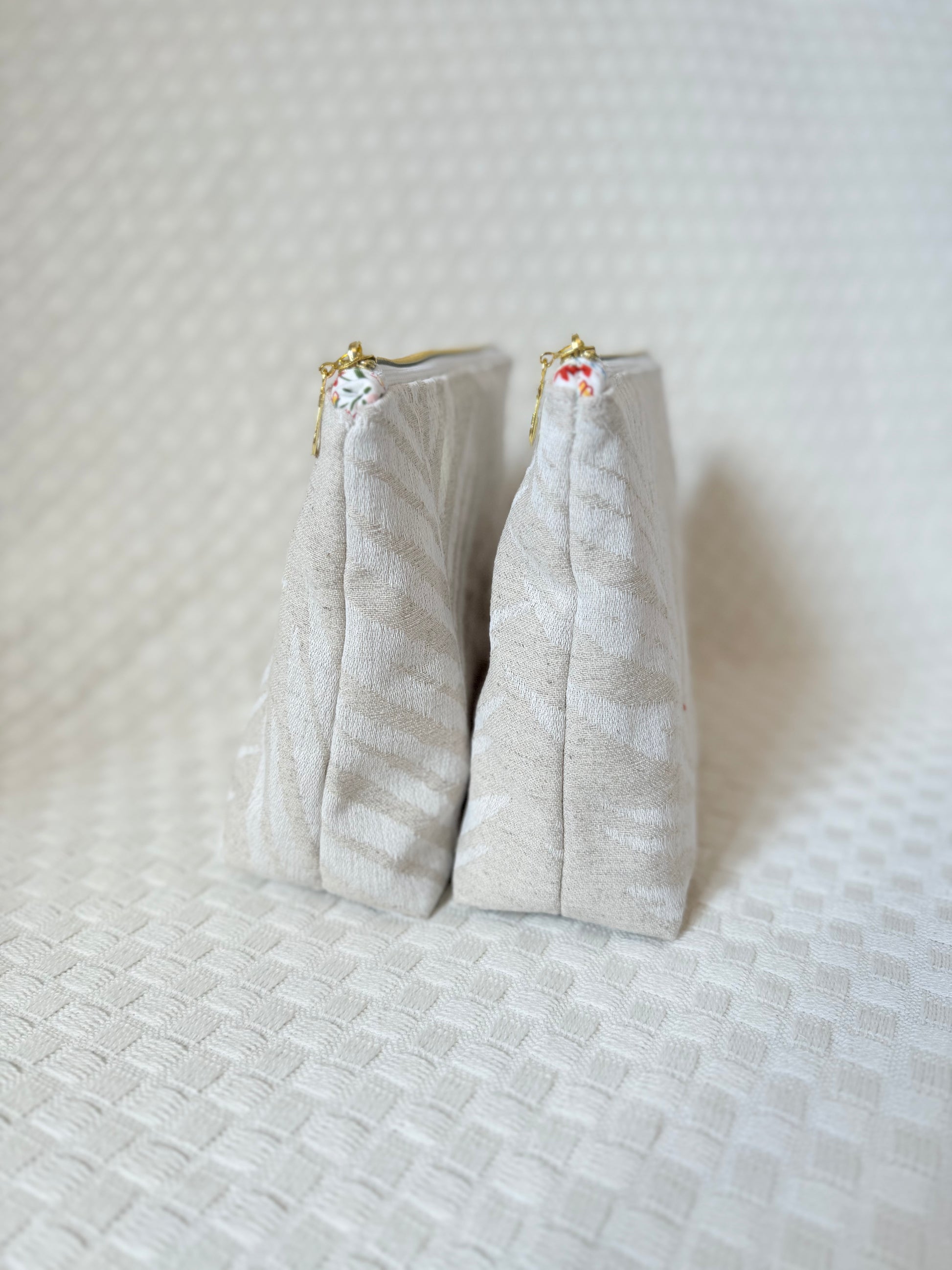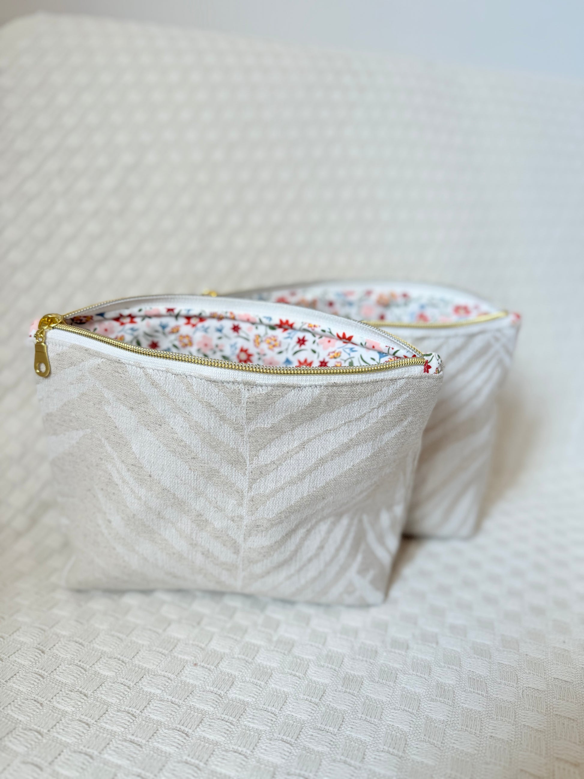 Ajoutez une touche naturelle et raffinée à votre quotidien avec cette trousse en tissu jacquard beige, subtilement ornée d’un motif feuille de palmier.